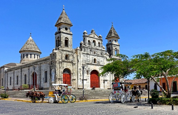 The Guadalupe Church from La Calzada street in Granada, Nicaragua.